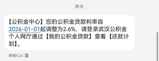 元旦当天,家住武昌的梁先生就迫不及待的打开手机,查询公积金贷款还款金额。下午,他还收到了公积金中心的短信提醒,通知他贷款利率调整至 2.6%。